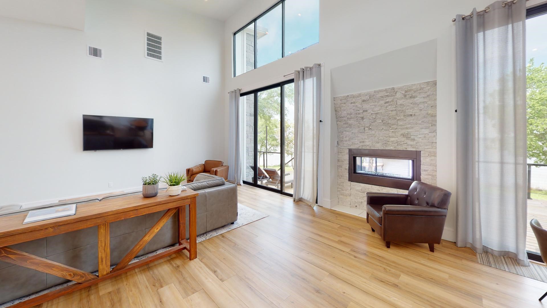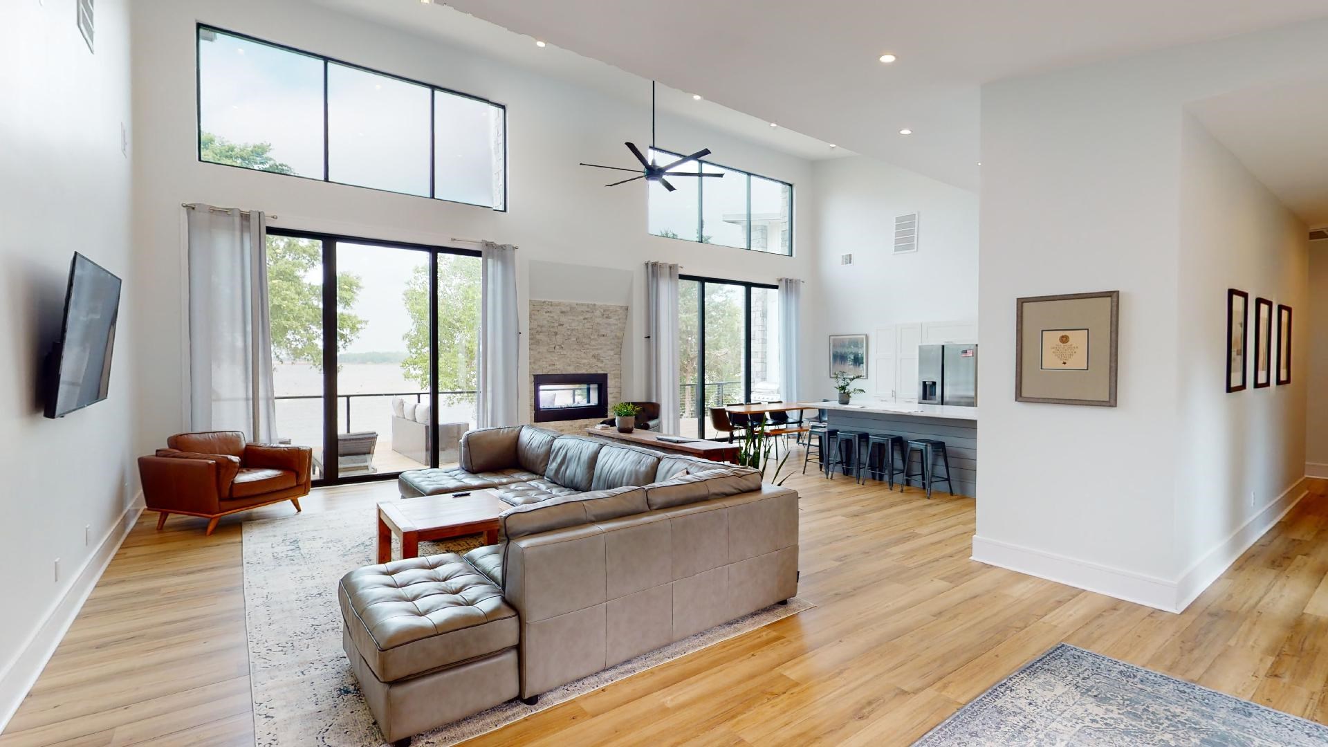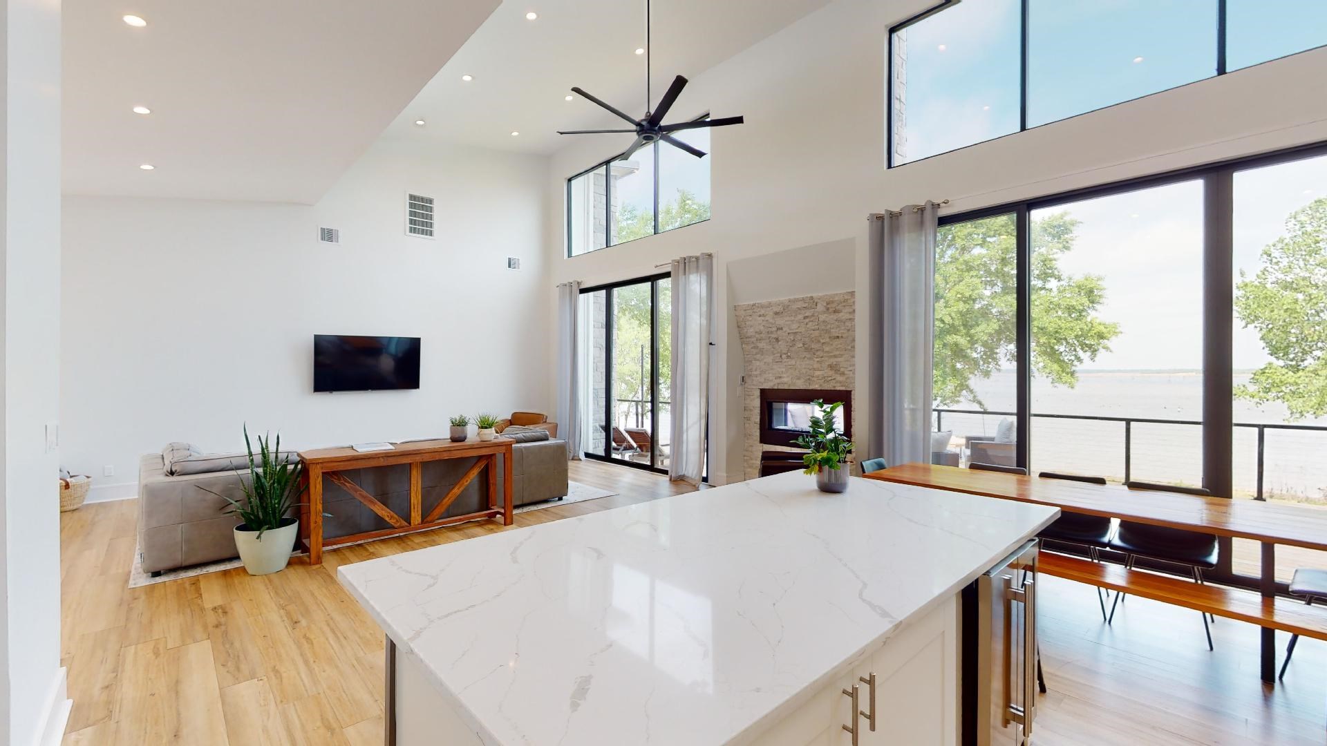 The great room and kitchen are the central focus for entertaining with 22 ft ceilings, giant windows looking at the lake and a see through fireplace. The kitchen is modern and well-appointed, with high-end appliances and plenty of counter space for cooking and entertaining.