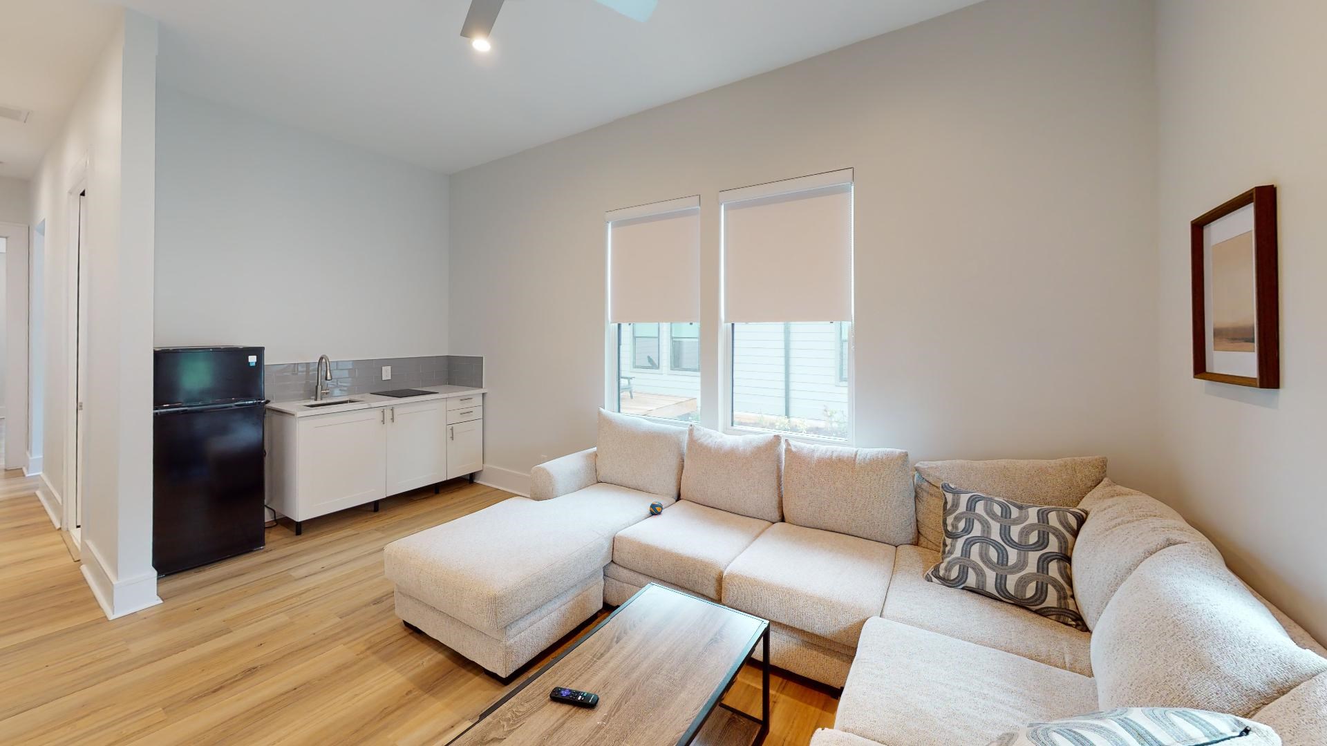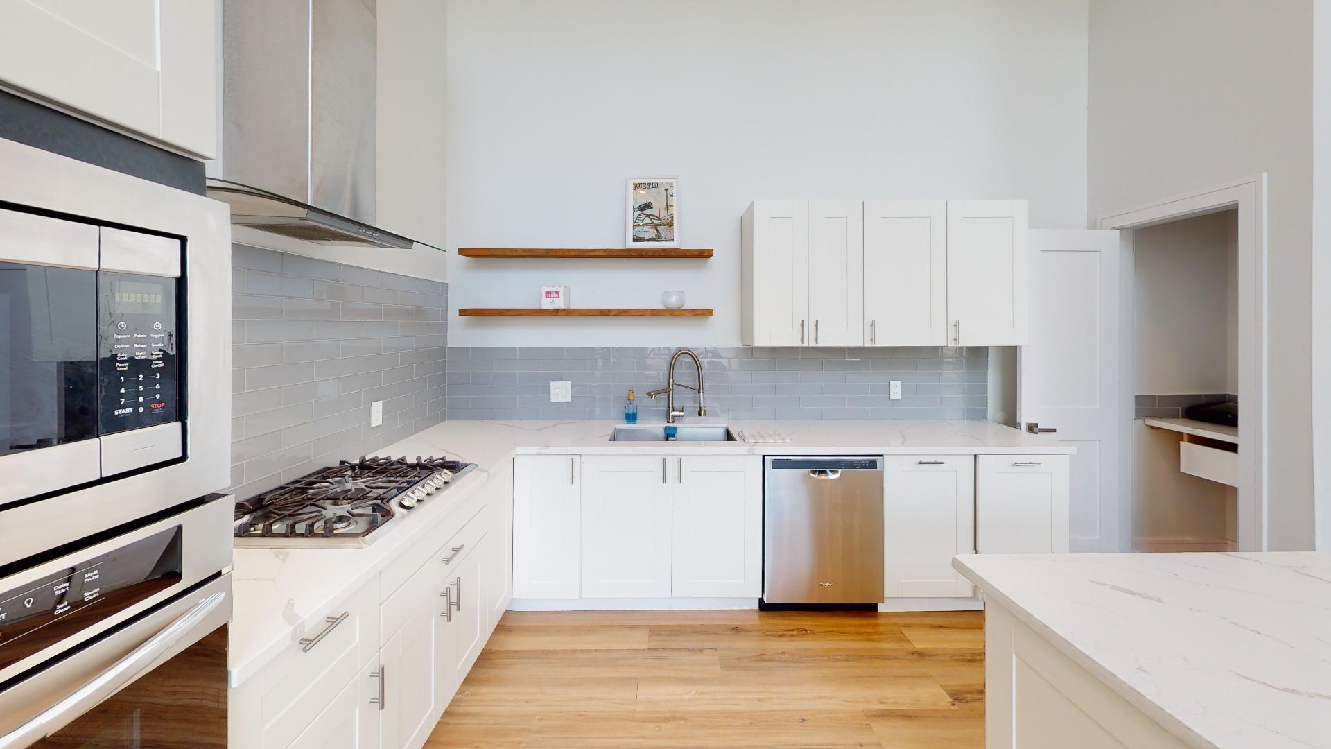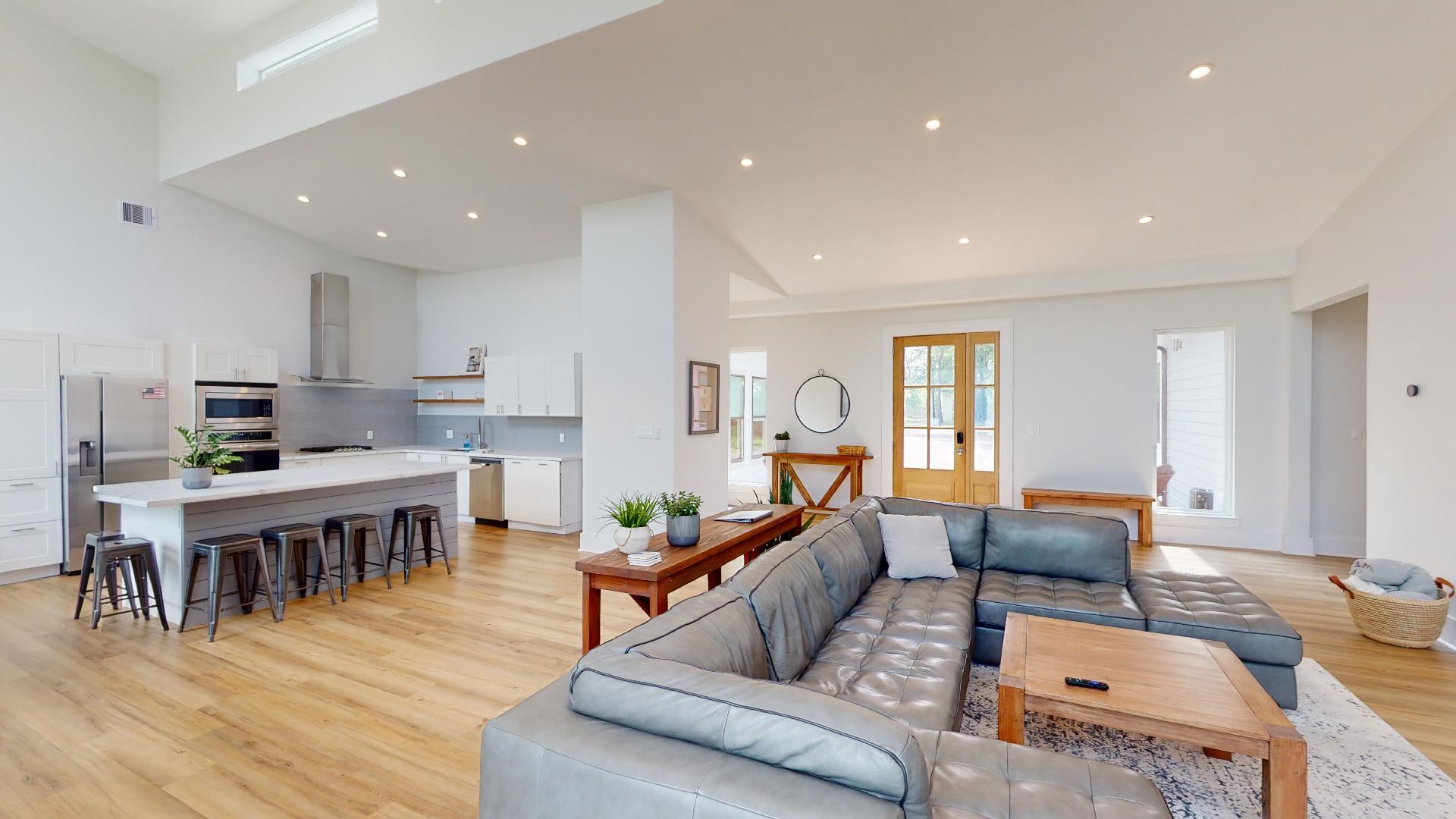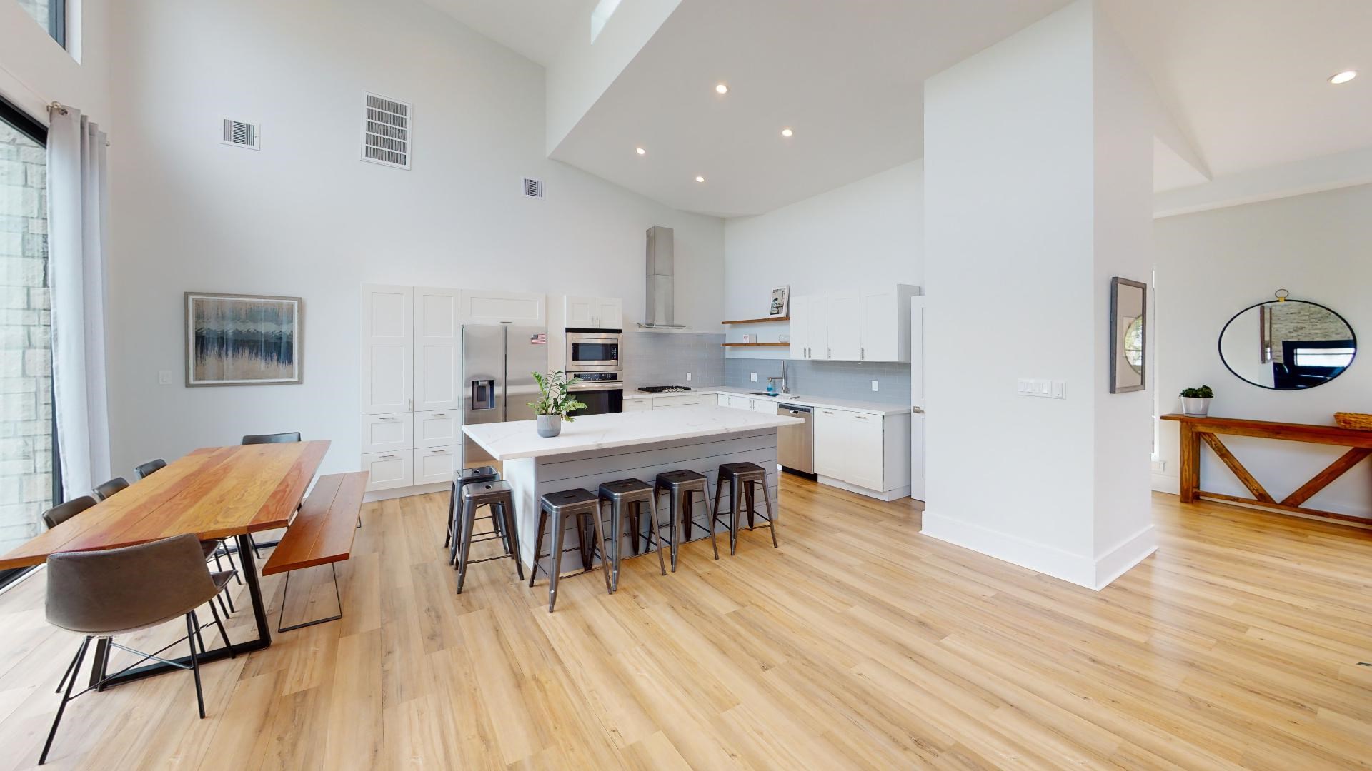 The great room and kitchen are the central focus for entertaining with 22 ft ceilings, giant windows looking at the lake and a see through fireplace. The kitchen is modern and well-appointed, with high-end appliances and plenty of counter space for cooking and entertaining.